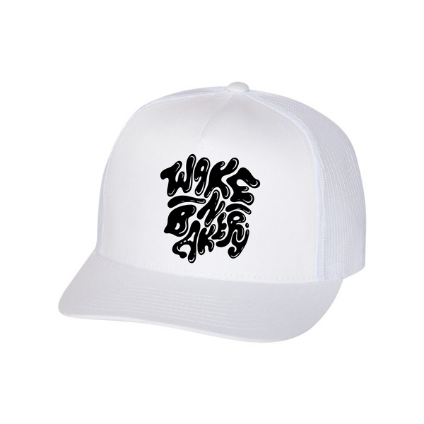 Wake n Bakery Black Flat Bill Trucker Cap, White